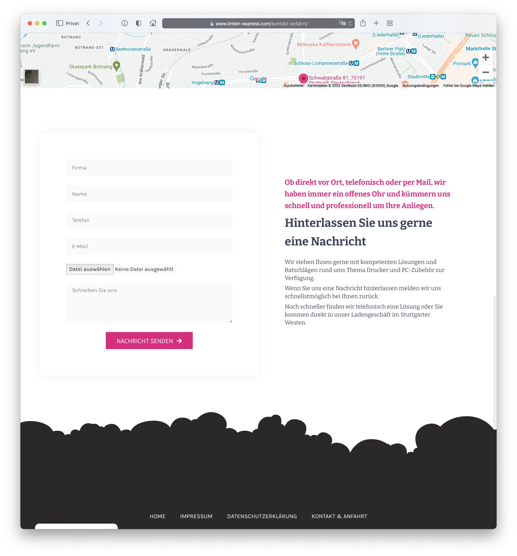 Diese Website ist ein sehr gutes Beispiel warum sich der Einsatz in Local-SEO bezahlt macht. Es sind nun einige Jahre seit dem Website-Relaunch von tinten-express.com vergangen. Inzwischen besetzt die Website mit den relevanten Keywords die führende Positon in Stuttgart.